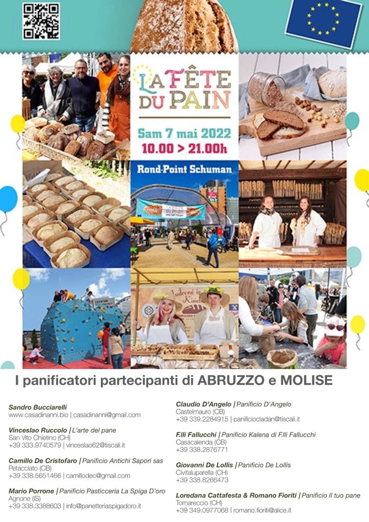 Le aziende dell’Abruzzo del Molise presenti il 7 maggio a Bruxelles a “La Fête du Pains”, sono: “L’Arte del Pane”, di Vinceslao Ruccolo di San Vito Chietino (CH), con il Pane biologico con farina Tipo 1, Pane di Solina della Maiella, Pane 3f aromatizzato con orzo, i dolci tipici della Costa dei Trabocchi come i celljpien al vino rosso e i bocconotti sanvitesi; “Panificio Antichi Sapori”, di Cammillo De Cristoforo di Petacciato (CB), con il Pane biologico di grano duro con semola rimacinata, I celliripieni di Petacciato e i mostaccioli al naspro al cioccolato; “Panificio D’Angelo”, di Claudio D’Angelo di Castelmauro (CB), con il Pane di farro, il Pane biologico con il miscuglio biologico evoluto del Molise e il cill, sia con il mosto cotto che con il miele; “Panificio Kalena”, dei F.lli Fallucchi di Casacalenda (CB), con Pane ai 7 cereali e Pane biologico con semola rimacinata di grano duro; “Panificio De Lollis”, di Giovanni De Lollis di Civitaluparella (CH), con Pane di farina di grano abruzzese Senatore Cappelli e i cellucci di Villa Santa Maria; “Panificio Il tuo pane”, di Loredana Gattafesta e Romano Fioriti di Tornareccio (CH) con celli pijne e mandorle; “Panificio Pasticceria La Spiga D’oro”, di Mario Porrone di Agnone (IS), con Pane biologico con farina Tipo 0, Ostie e Uccellini tipici di Agnone; “Azienda agricola La Casa di Nanni”, di Sandro Bucciarelli di Chieti (CH), con prodotti biologici quali Olio, Salse di pomodoro e Tabenades vegetali.
